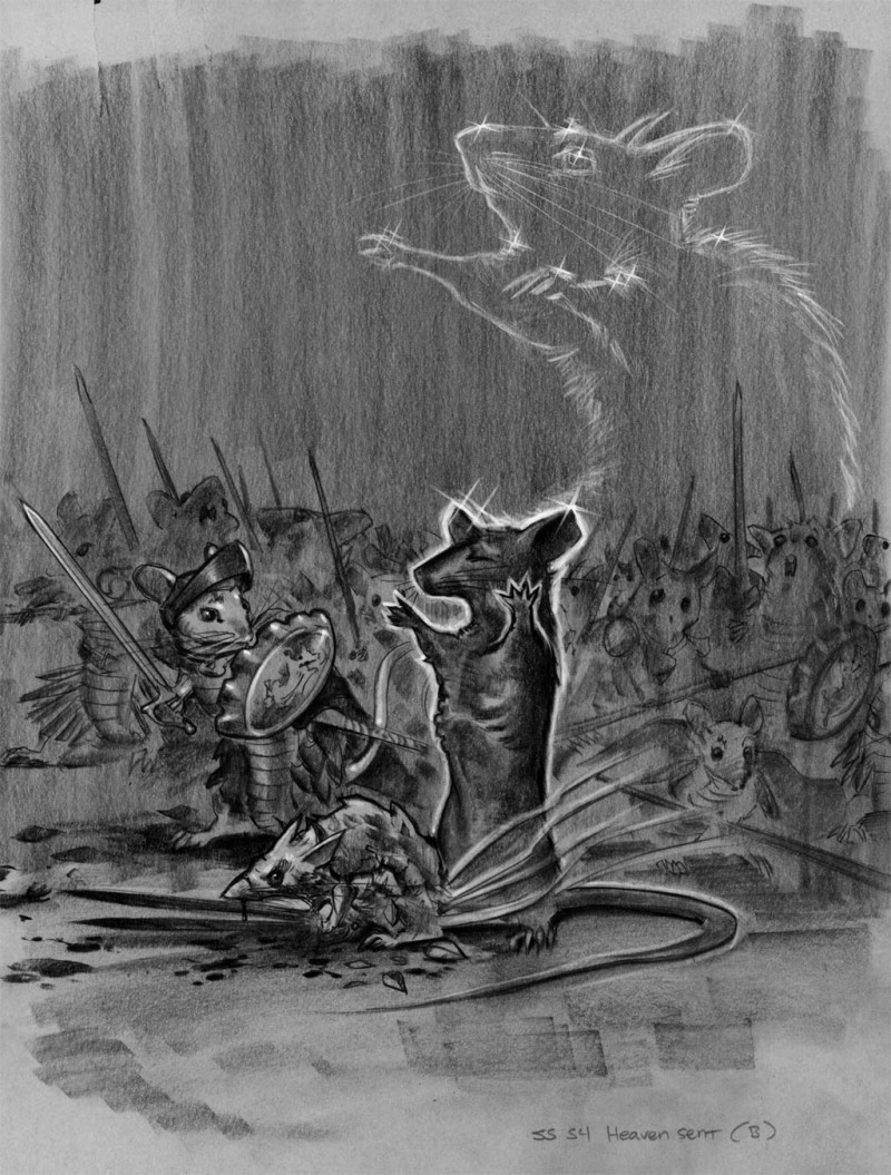 "Squibble," my master said. "That was amazing." The look on his face was strange. Other mice were hauling bodies and wounded to the back of the house. But the knights - the vanguard of our defense, sat there staring at me as if I were on fire. Not one of them blinked.