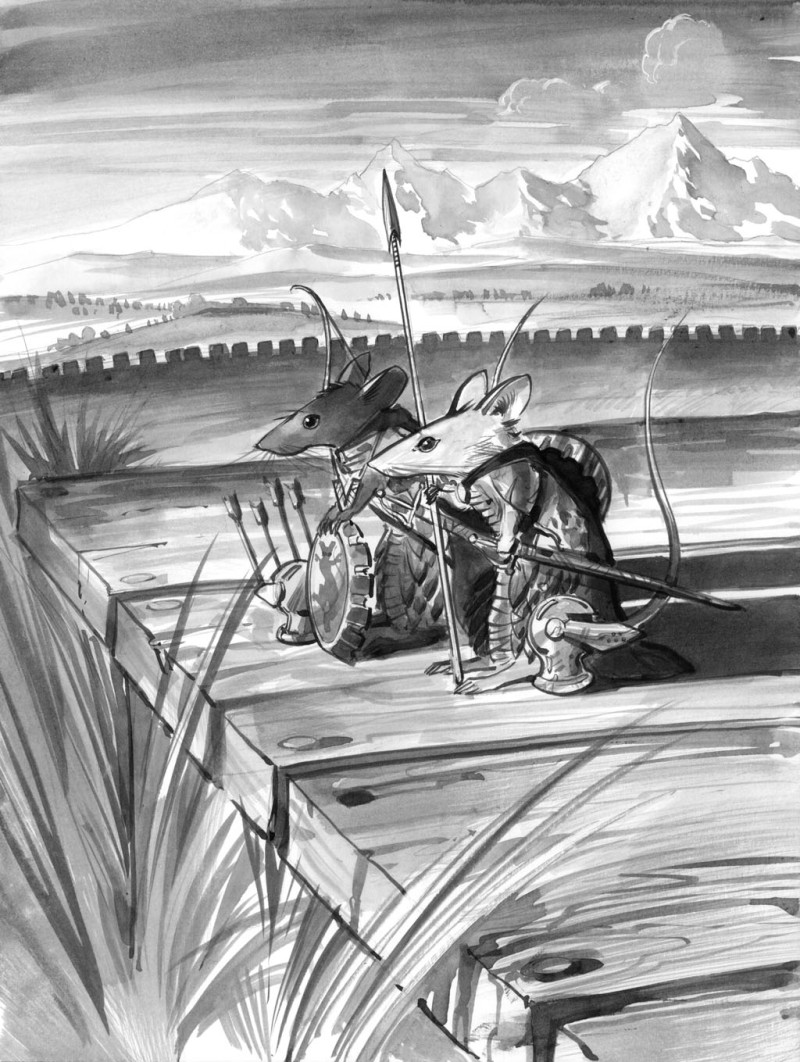 The ceremony to decorate me with that medal came right after that, which I felt was weird, but I liked everyone clapping and chirping for me. Everyone seemed to like me again. I had gotten back my honor to some degree, bestowed upon me by King BJ, Nemo, and my beloved master. It was a high point in my life, and they called me smart in front of everyone. BJ even said "Not crazy. Smart! Smarter than any of us have been," as he put the medal around my neck and pinned the smaller representation onto my tunic. I loved what he said, the pride in his face and the look of delight in my master's eyes. I painted a mouse hopping out of a box on the inside of my shield and armor. Scratchy watched me do it with great interest. I could tell he wanted a medal very badly.