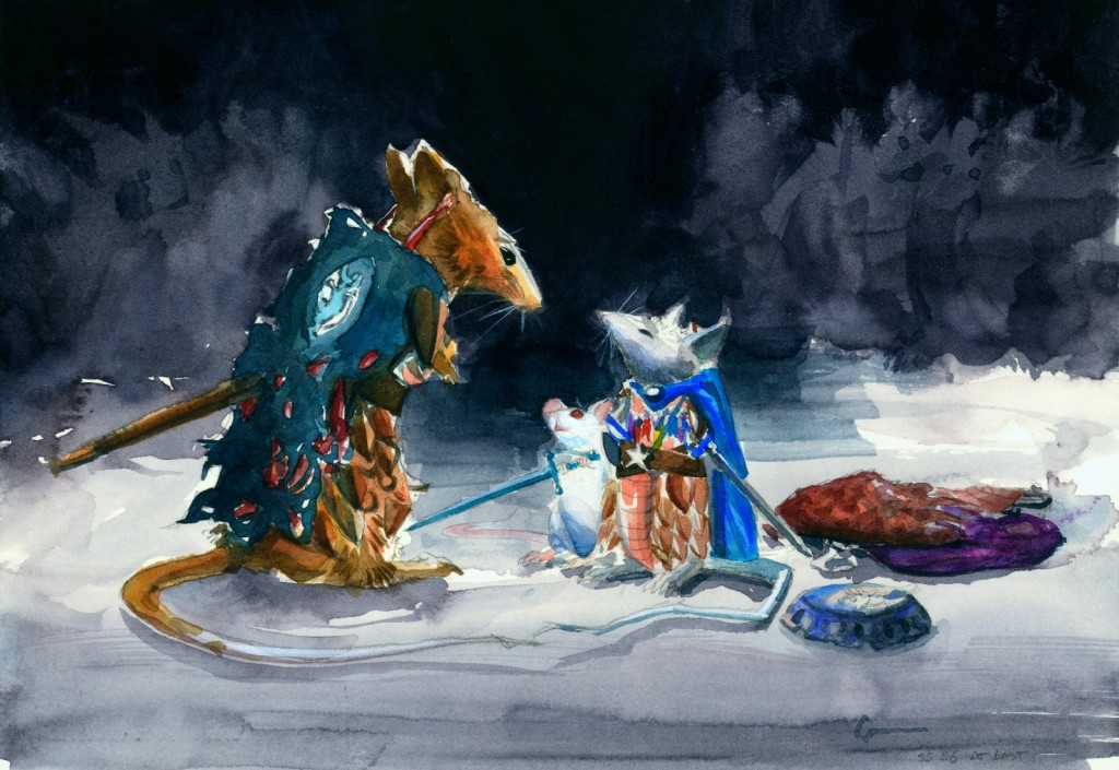 Everyone just gawked at me for long moments. For all of my damage and need of healing, something had broken in me, and it broke the hard way. I could explain it not one bit, but instead of hatred, I now felt nothing but love for the tiny cripple that had given his entire life to me. He was as old as I was. We were in what was almost always a mouse's last months. And here he was, still guarding my things, because I wasn't there to be guarded. Through his armor I could see a hairless spot and scar where he had been run through. My master had been right. I could not ask for a more loyal servant. But his servant days were over, and should have been long ago.