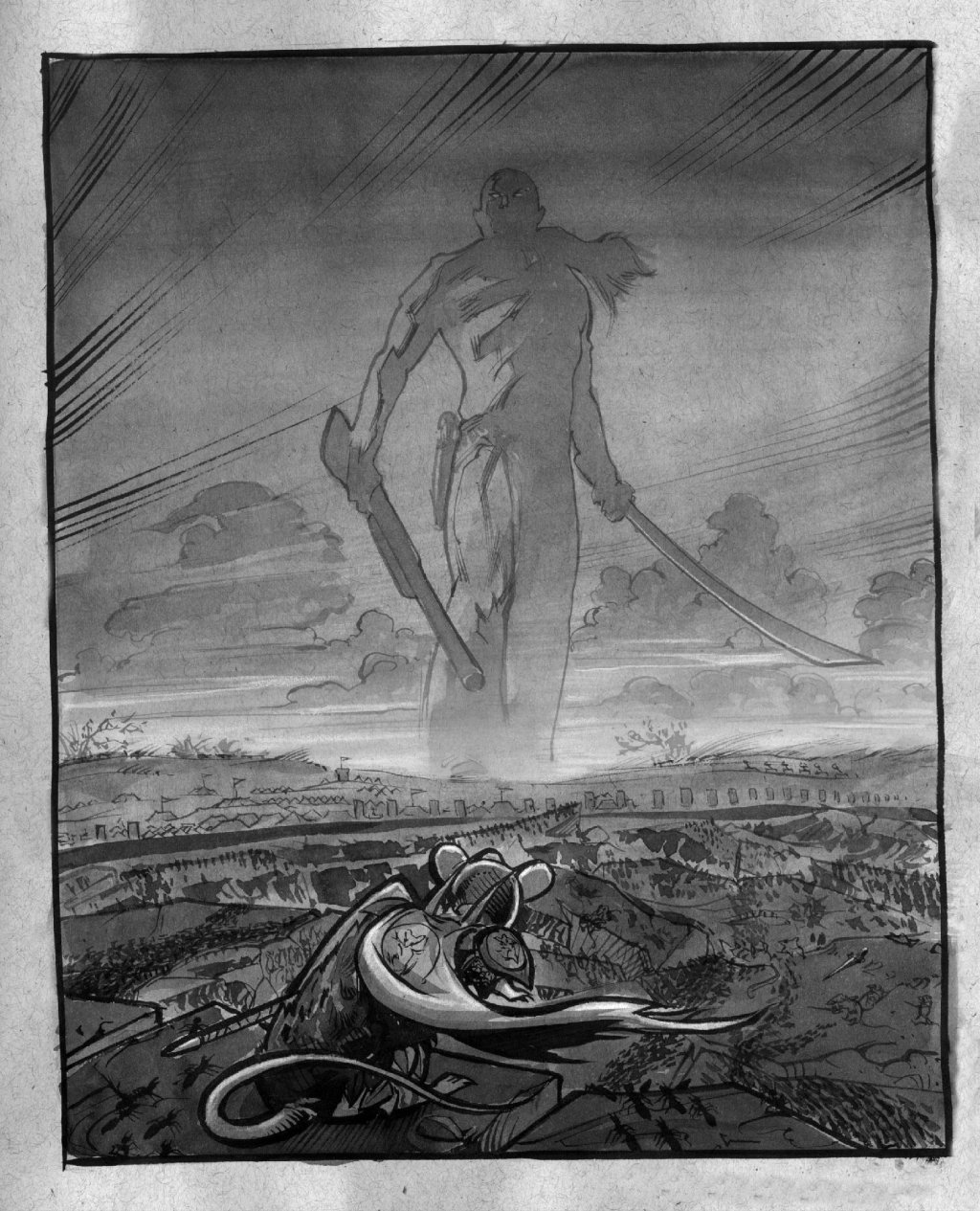 Then, in the darkest of night before dawn, we heard the thunder of great footsteps. Against the horizon, we saw a towering silhouette of a man. I thought to myself, O great Mousegod, has the black mouse grown so powerful that he now commands men? I had but a moment to look before a coyote set himself between me and the sword. The ants warned me, but I could not dodge in time. The valiant rat beneath me bucked and sent me flying as the coyote lunged. Its decaying teeth snapped shut over where I had been. My mount died saving me from that dread blow, and I hit the ground hard. In the air, I saw three of the great undead beasts in hot pursuit of my father. He would not reach the river.