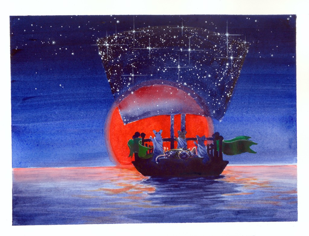 She looked across the waves at me and smiled. Then the three of them held up one paw each, and the ship sailed slowly into the sun as I watched. It passed on with the sunset, and faded from my sight.