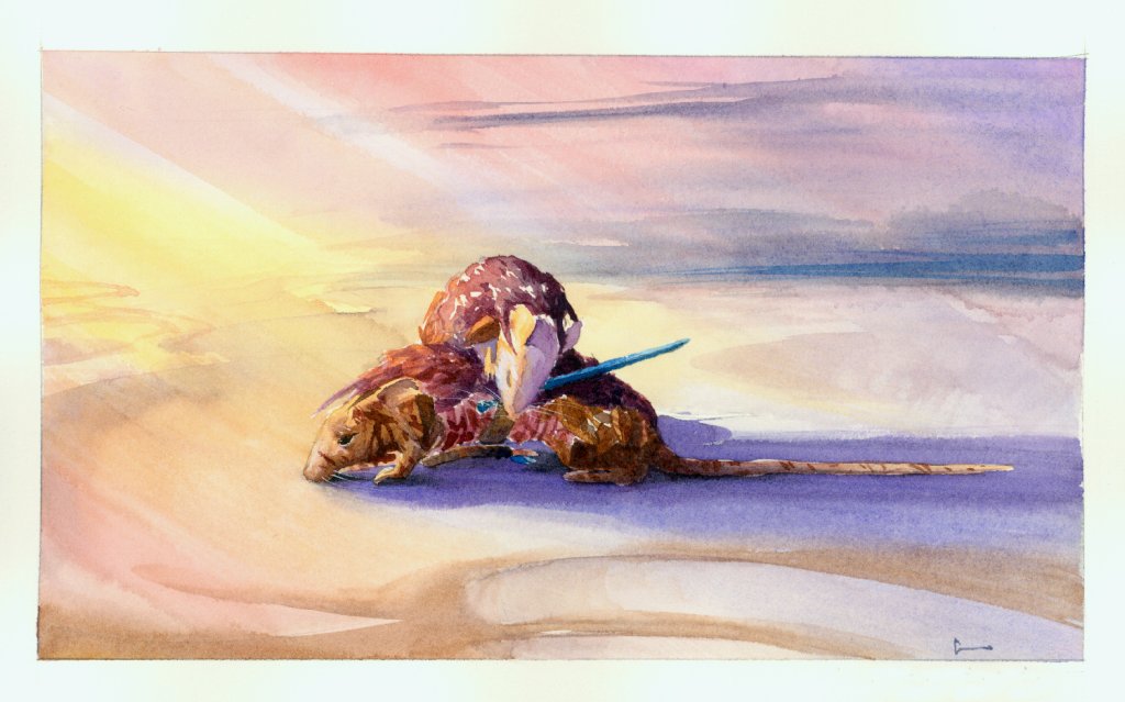 He was lying on the rear deck of a mighty ship, sailing just past the waves. It was silver and gold, with sails of starlight. The setting sun turned it into a silhouette, but I saw clearly my master laid upon an altar of stone, wearing his armor and shield, a sword across his still breast. His eyes were closed in peaceful rest. About him were three lady mice, glowing with power. One young, one old, and the one in the middle was...my mother.