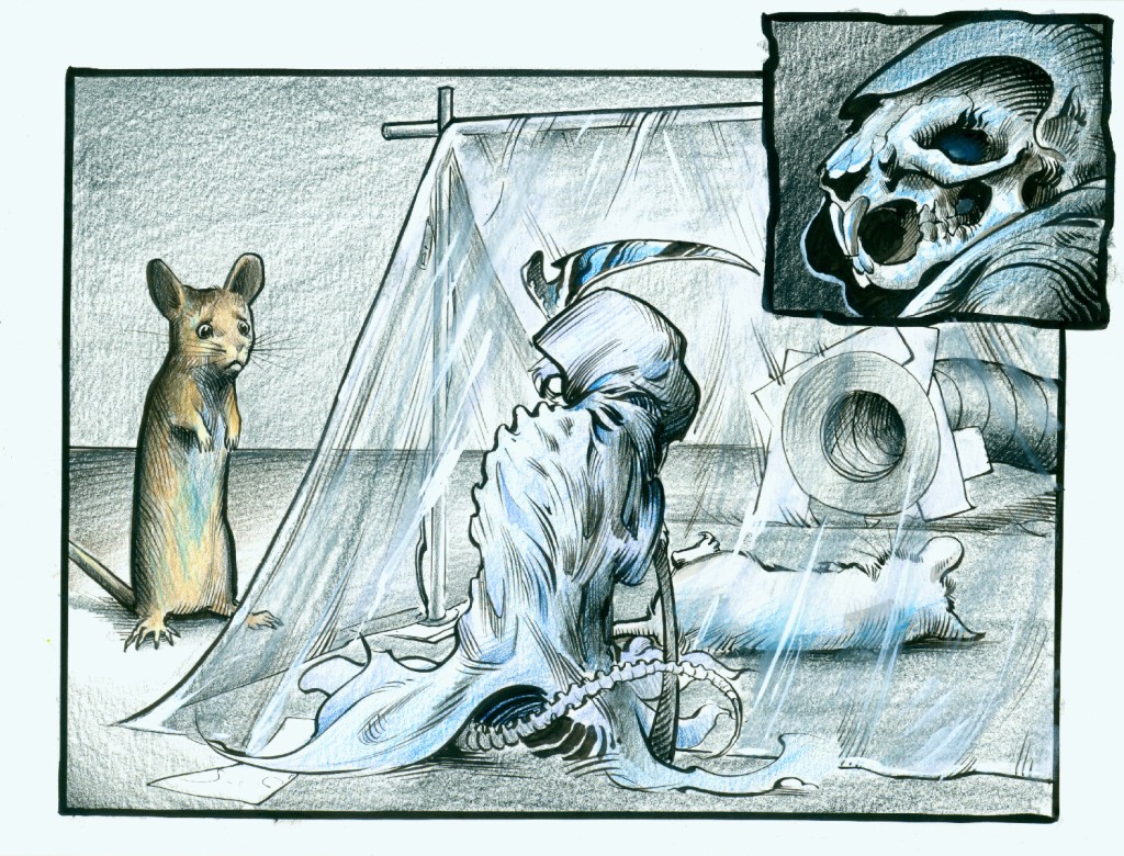 When I approached, it turned to me, and my heart skipped a beat. Beneath its ragged cowl, there was nothing but a mouse skull! The robed figure was Death.