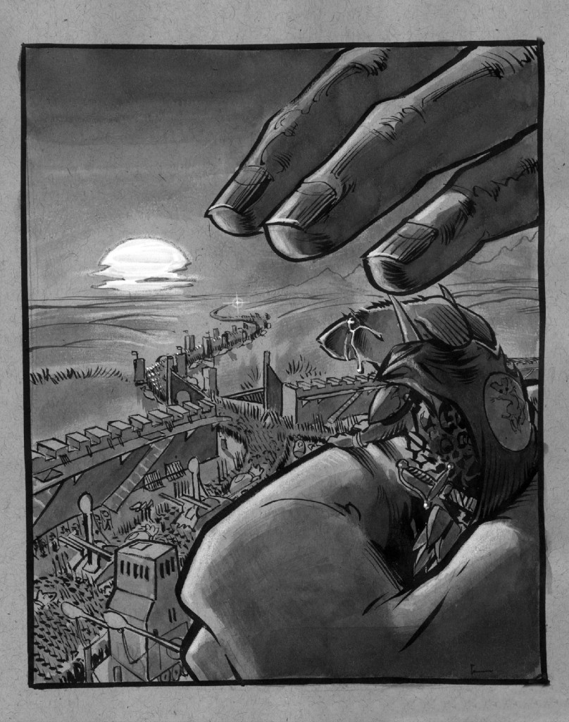 As the sun descended upon the horizon, the armies were gathered and ready. Column after column were arranged before the house, in the front yard. Part of the barrier wall had been removed to let us march forth. I was wearing my armor, bearing all my weapons. I left the comic drawing on my shield. I thought it was funny. Maybe the black mouse would see it and at least be irritated.